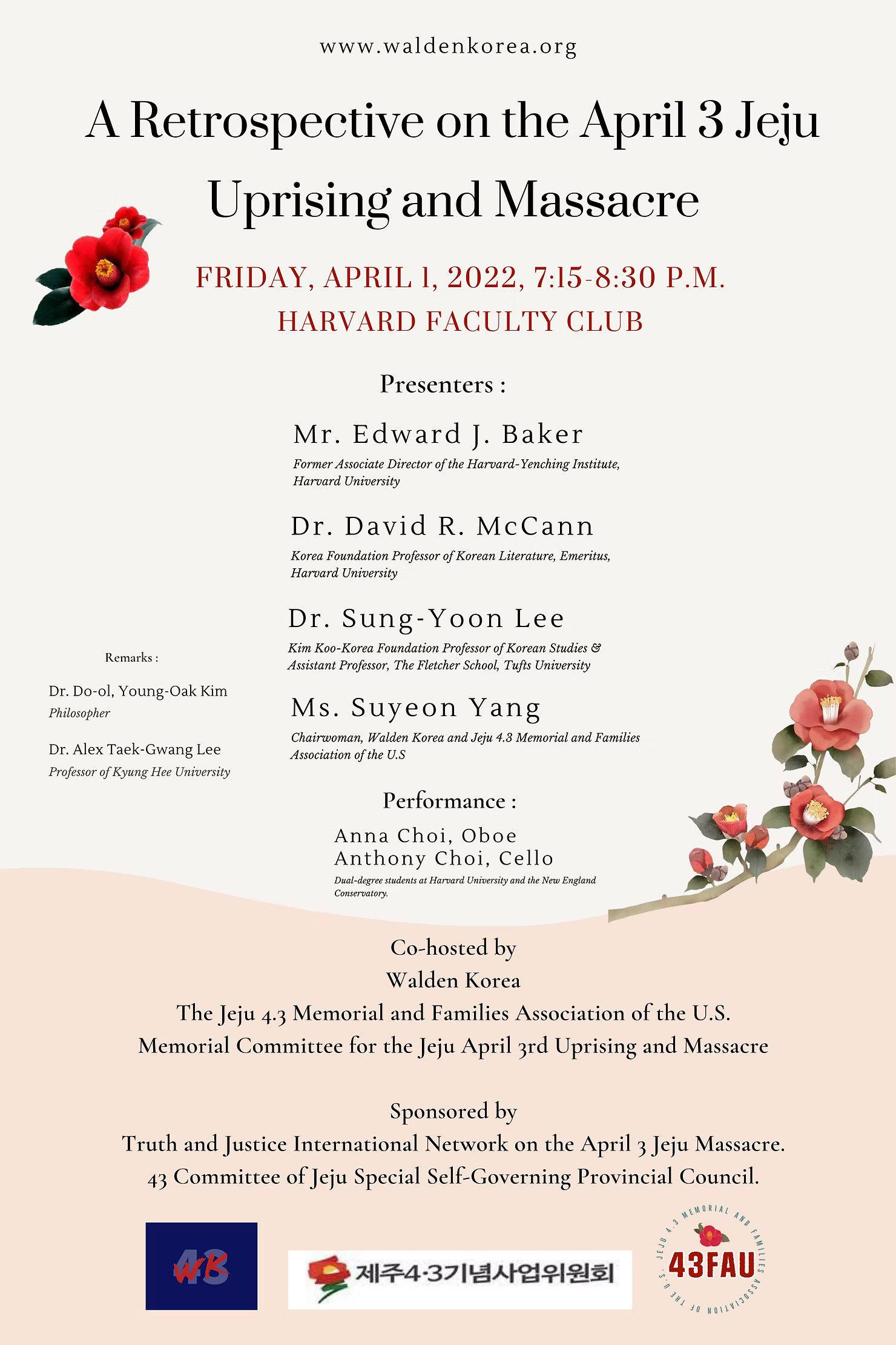 1945년 이후 한국 역사상 최대 규모의 평시 민간인 학살인 4·3 제주 4·3은 연구와 기억, 화해를 필요로 합니다. 1947년 3월 1일부터 1954년 9월 21일까지 7년 7개월 동안 30,000명 이상의 무고한 민간인들이 공산주의자들을 진압한다는 명목으로 정부 당국에 의해 학살되었습니다. 학자들은 이 비극을 동북아 냉전의 시작점 내지 동북아 냉전으로 가는 중대한 전환점으로 보고 있습니다. 약 74년이 지난 오늘날에도 진실, 책임, 정의, 화해는 아직 완전히 확립되지 않았습니다. 이번 제74주년 제주43희생자미주 추모식은, 정의, 인권, 역사적 기억의 프리즘을 통해 제주43을 바라보고자 합니다. 새로운 냉전의 시작일 가능성이 있는 우크라이나 전쟁 희생자를 함께 추모함으로써 제주43 비극에 대한 새로운 시각을 제공합니다.
