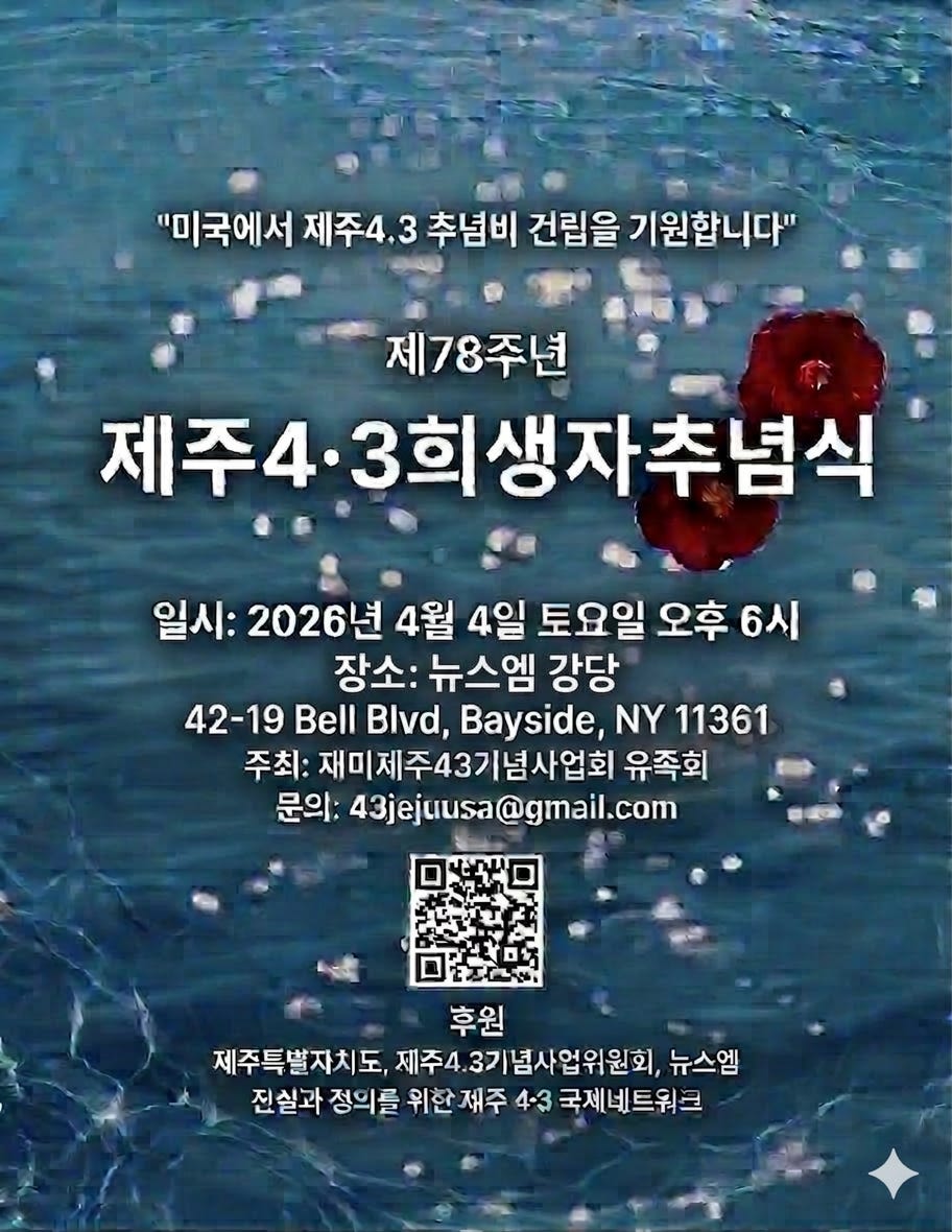 재미제주43기념사업회 유족회는 오는 2026년 4월 4일(토) 오후 6시, 뉴욕 베이사이드에 위치한 뉴스엠 강당에서 제78주년 제주4·3희생자추념식을 개최한다.